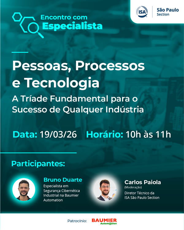 A ISA São Paulo Section realizará no dia 19 de março de 2026, das 10h às 11h, mais uma edição de nosso evento virtual, Encontro com Especialista, que terá como tema “Pessoas, Processos e Tecnologia – A Tríade Fundamental para o Sucesso de Qualquer Indústria“.